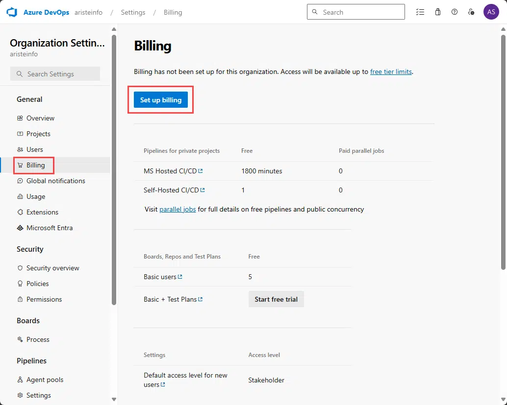 - One Microsoft-hosted CI/CD (one concurrent job, up to 30 hours per month)